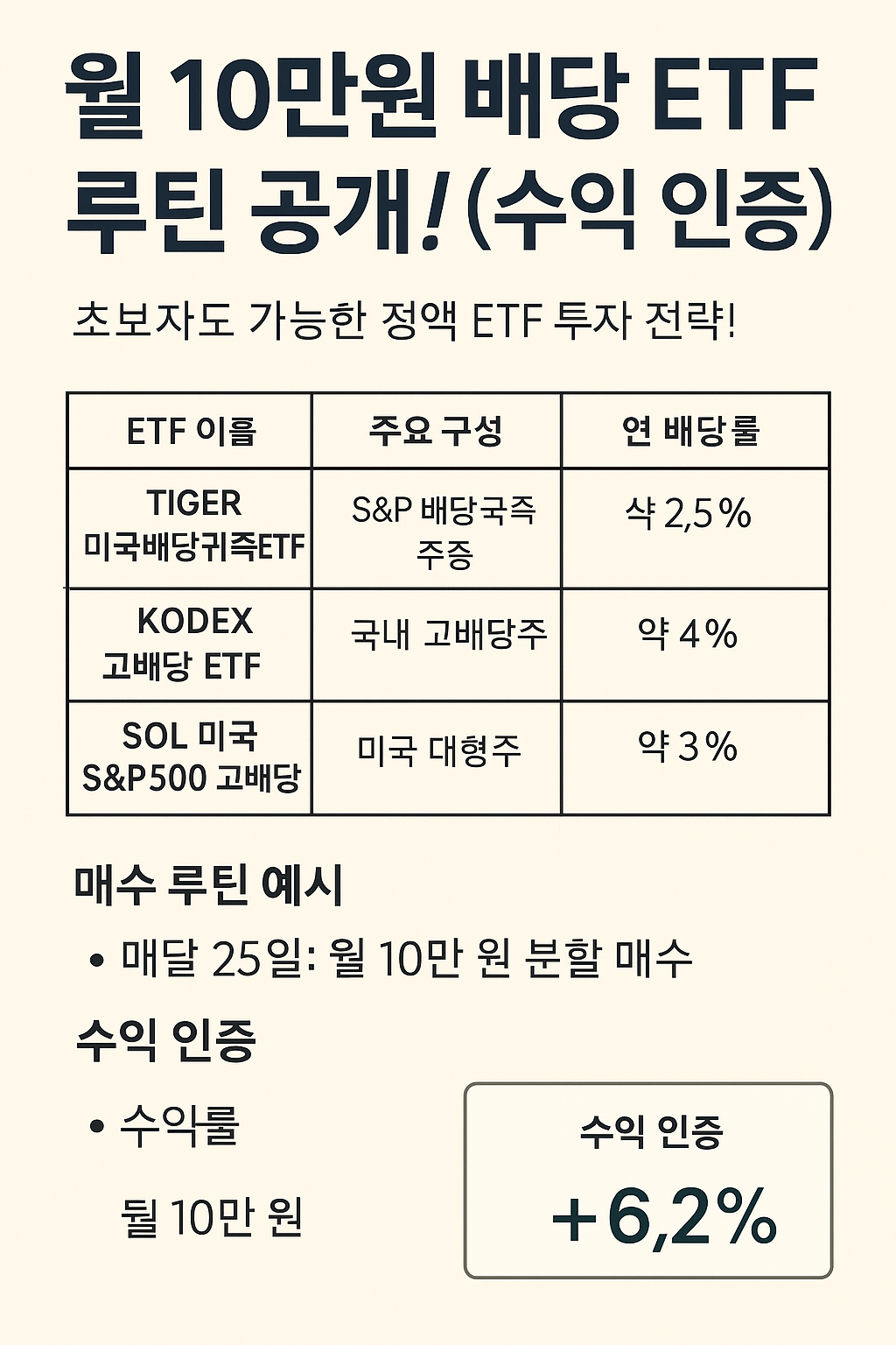 TIGER 미국배당귀족ETF 미국 배당 귀족주 약 2.5% 꾸준한 성장 + 안정성 KODEX 고배당 ETF 국내 고배당주 중심 약 4% 고정 배당수익 추구 SOL 미국S&P500 고배당 미국 대형 고배당주 약 3% 월 배당 + 분산 투자 🔎 미국 배당은 분기마다, 국내 배당은 연 1회 또는 2회 지급됩니다.